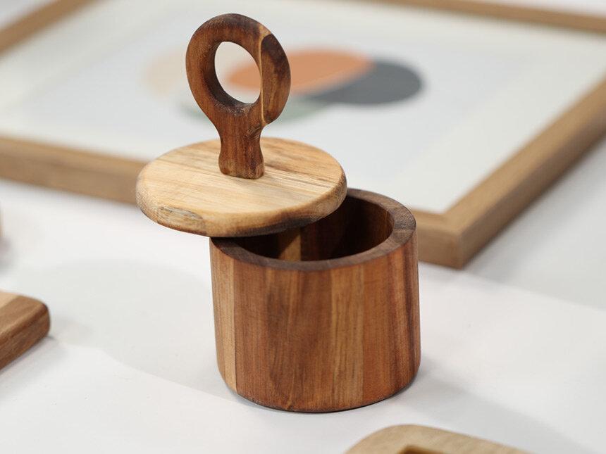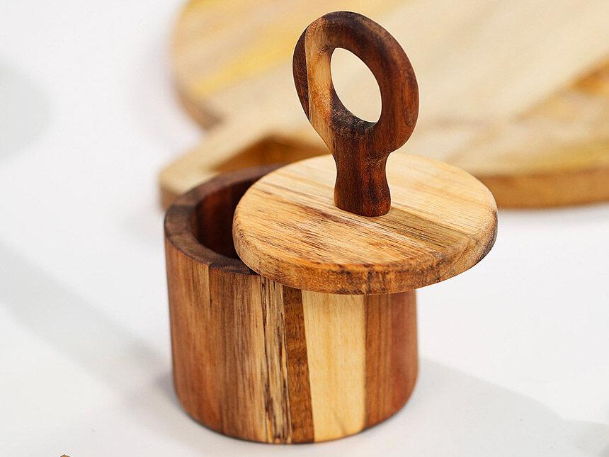 Rich Acacia grain. All-natural salt cellar. Charming, carved-loop lid.