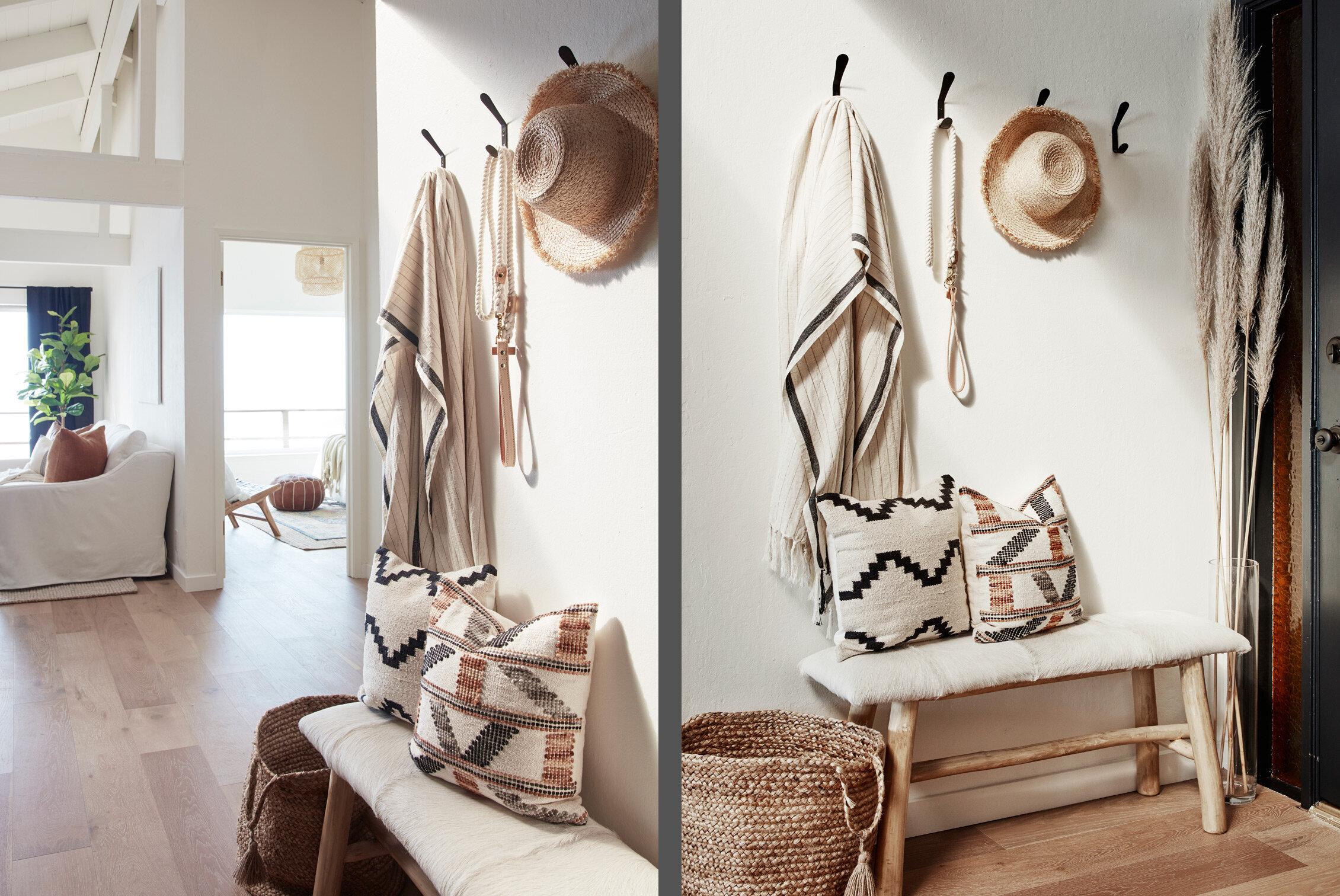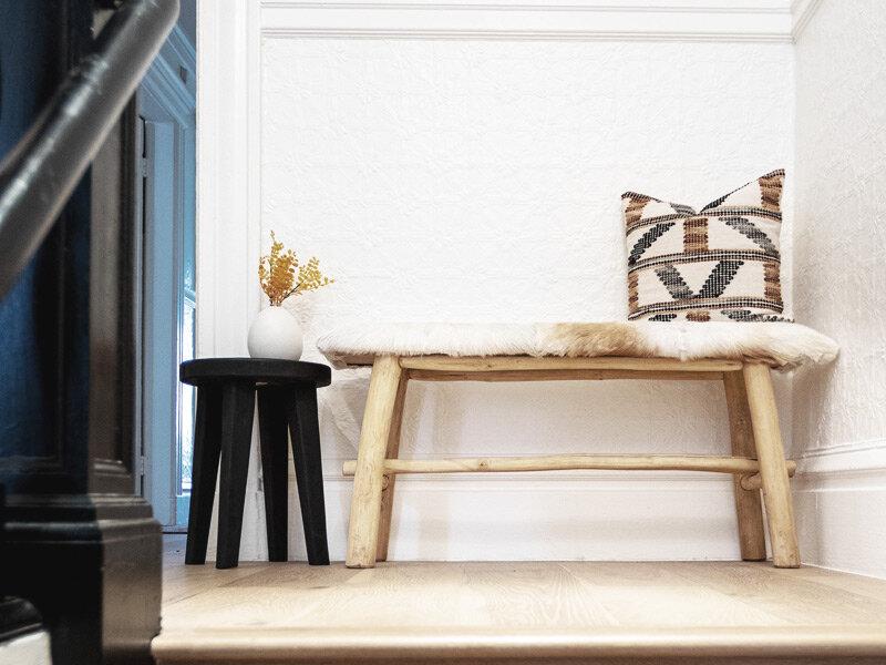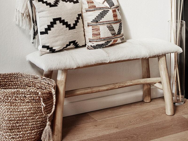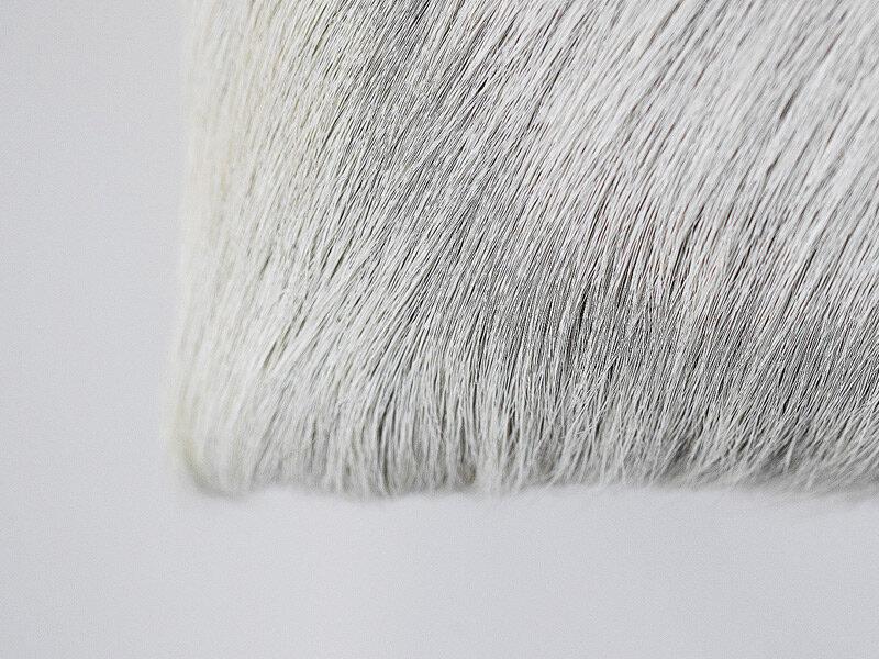 Sleek, white goat fur. Natural hide—no two alike. Organic wood legs.