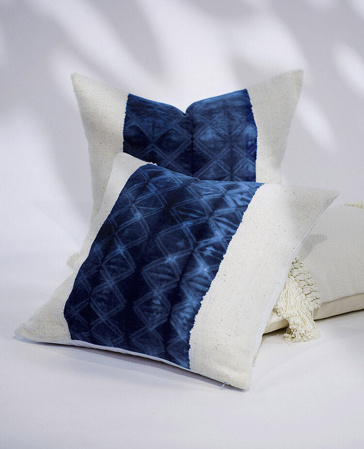 This handmade Shibori textile hails from Noida, India and is flanked with 100% natural cotton mud cloth from Mali, Africa – making for a worldly addition to your space. Originating in Japan, this design style comes from one of six resist-dying techniques. 'Itajime Shibori’ is the style we opted for in this kit, which is created by folding organic cotton cloth accordion-style and dyeing the edges to create a triangle-like pattern. The Shibori Duo styles beautifully in front of the Baoulé Trio while the Magu lumbar effortlessly tops off this tailor-made pillow arrangement.