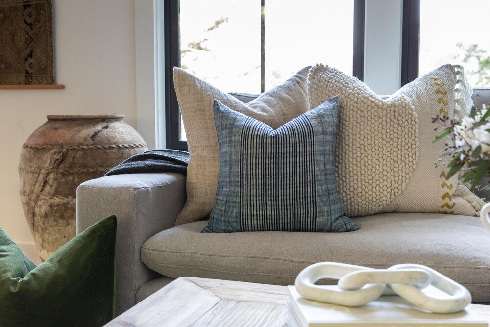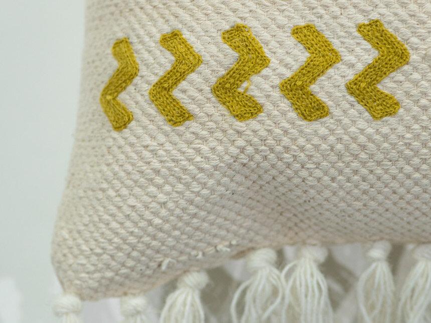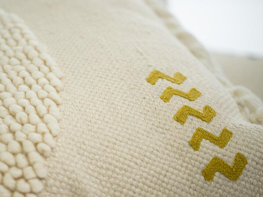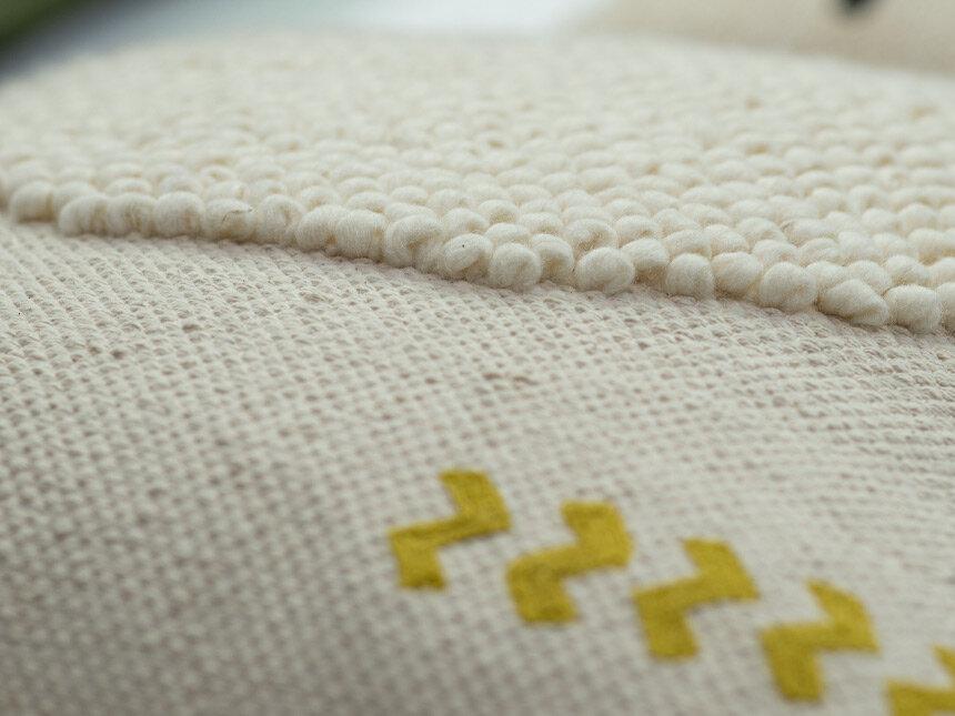 Designed in-house. Hand-looped with wool and loomed with cotton by artisans in India. Ochre motif detail.