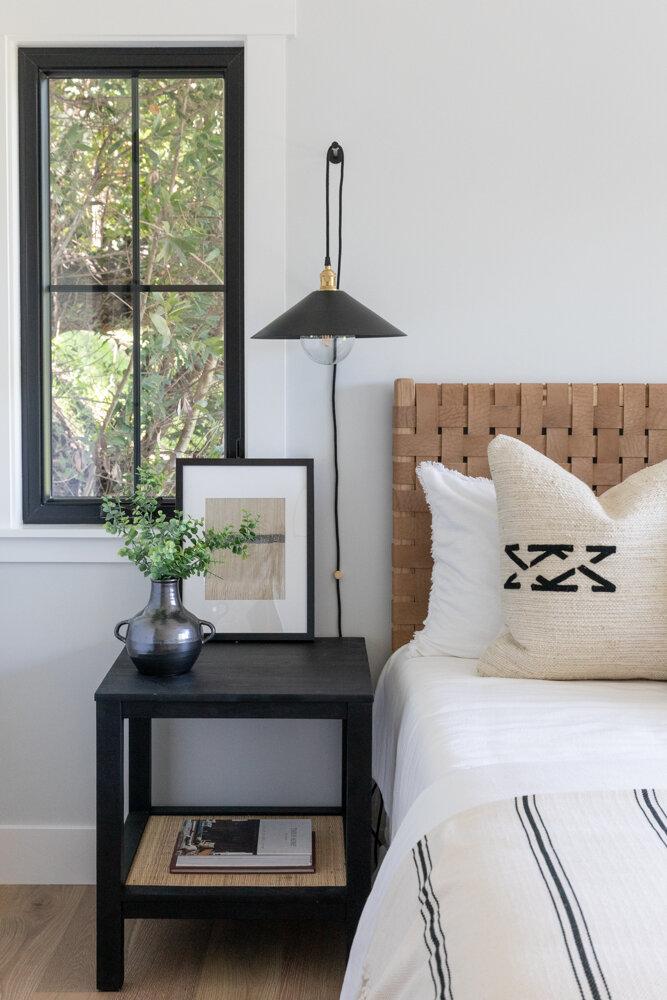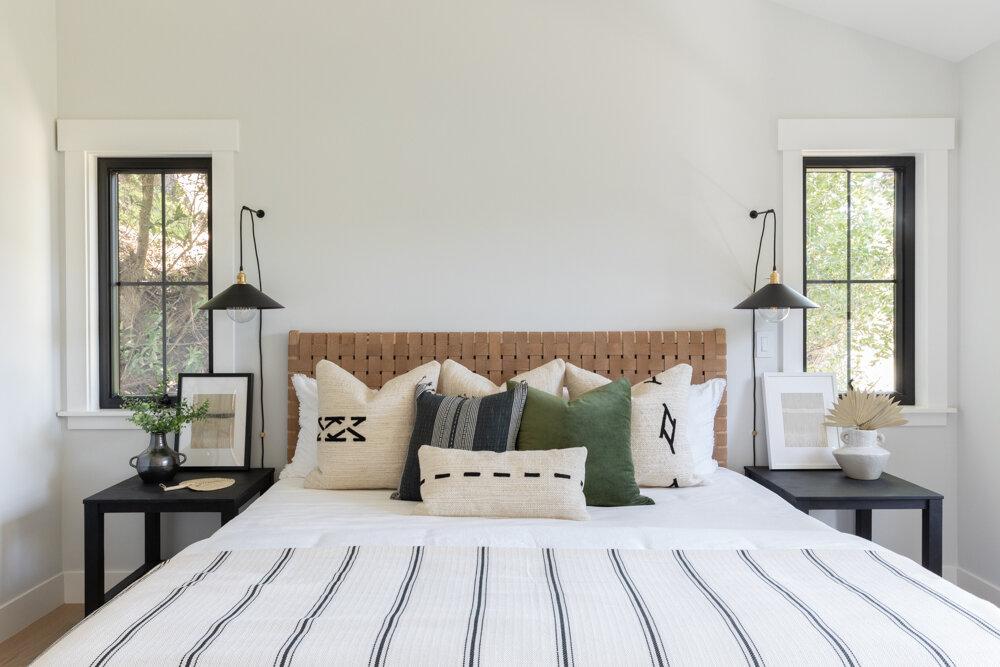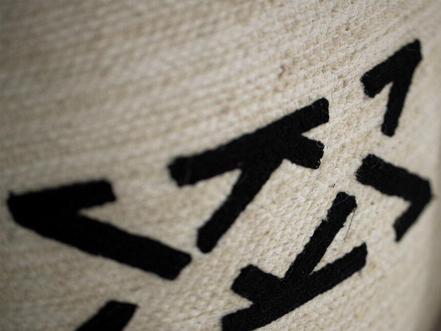 Designed in-house and hand-loomed in India, this pillow makes a statement with a bold, black embroidered motif that pops against an earthy palette of loomed wool and premium cotton.