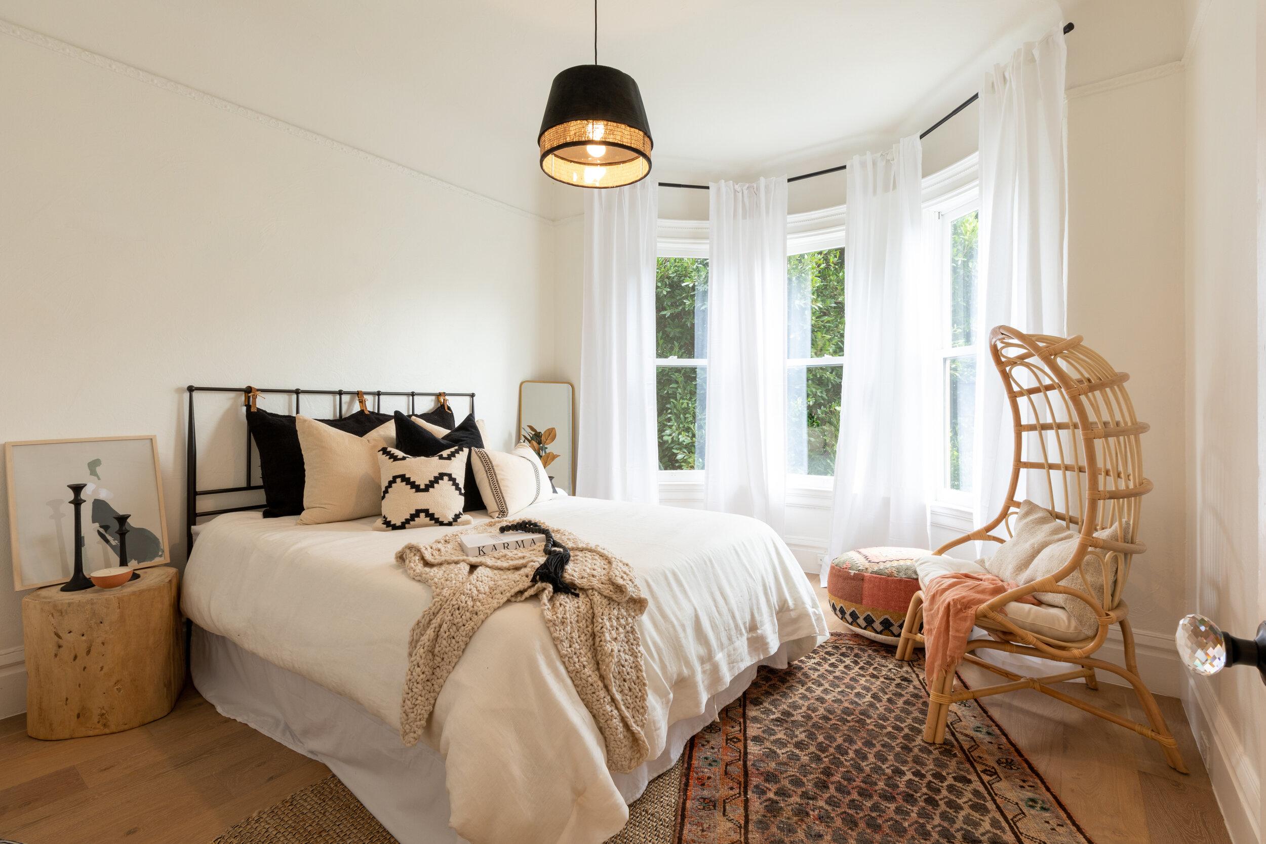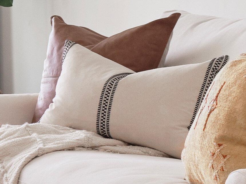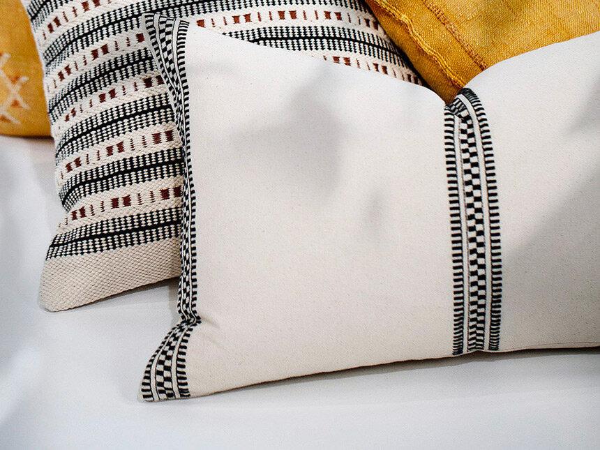 Hand-stitched in India. Black checkered detail on ivory cotton.