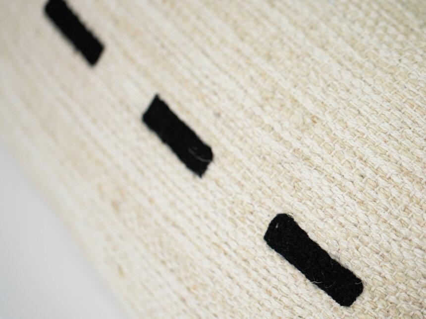 Designed in-house and hand-loomed in India, this pillow makes a statement with a bold, black embroidered motif that pops against an earthy palette of loomed wool and premium cotton.
