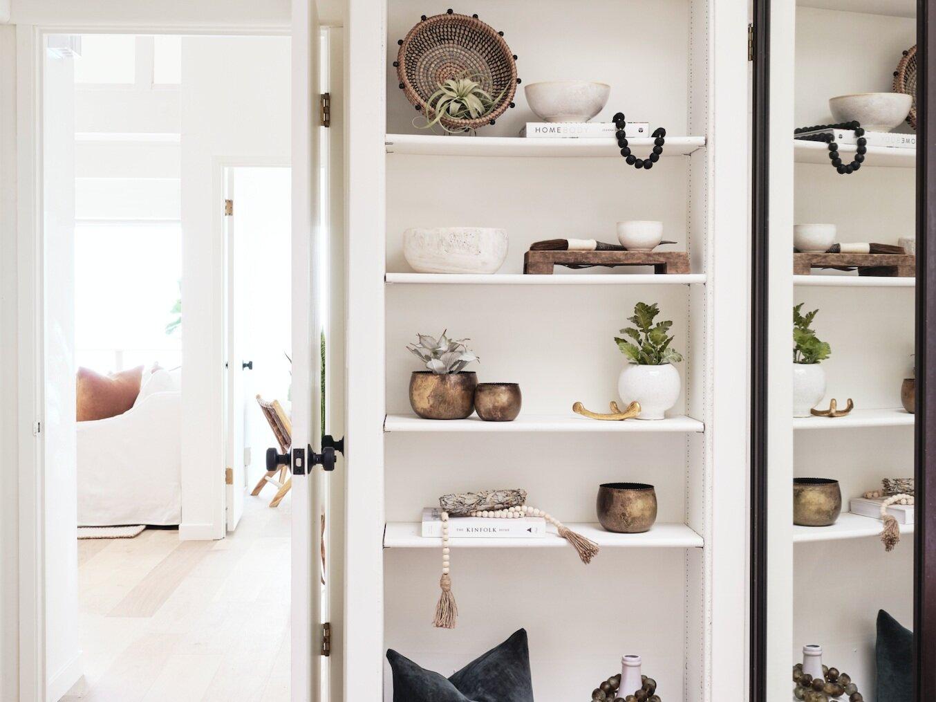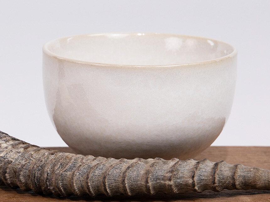 Stoneware. White finish with a natural color trim. Raised base. Petite presence.