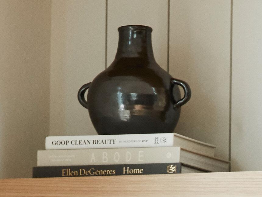 Metallic reactive glaze coats a terracotta jug silhouette. Styles effortlessly, especially with pops of green.