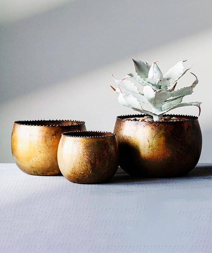 Terracotta colored cement pot. Faux succulent planted in stones.