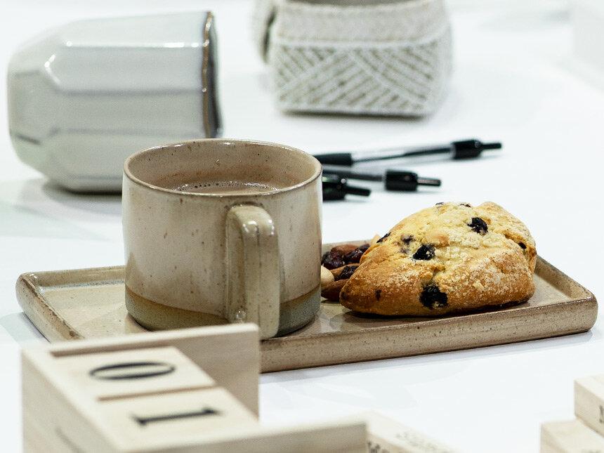 Stoneware mug and plate pairing with reactive glaze make staying fueled for work a breeze.