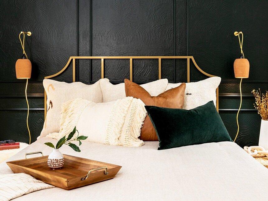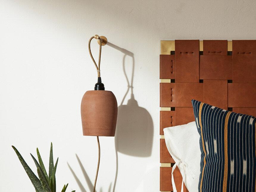 IW-Designed. Each handcrafted terra-cotta sconce has been rinsed, sun-dried and sanded to achieve a light matte finish. Each shade pairs with a premium, 15’ brass fabric cord (with an in-line switch), and an easy-to-install brass swag hook (wall anchor and screw included). The Sophia Sconce elegantly suspends over the center of any nightstand while warm, soft light emits from each to create a naturally relaxed bedroom mood.
